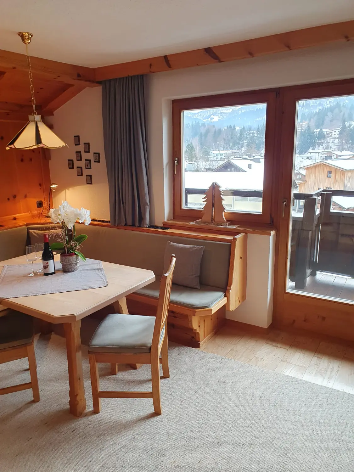 Gemütliche Essecke im rustikalen Tiroler Stil mit gepolsterter Eckbank und Holztisch. Auf dem Tisch stehen Weingläser und Orchideen, im Hintergrund der Blick durch das Fenster auf das verschneite Fieberbrunn.