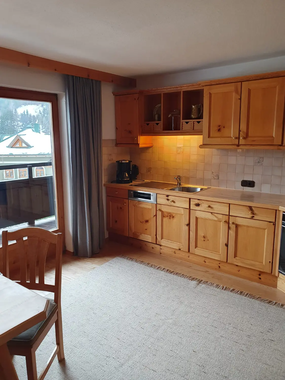 60m² Ferienwohnung: Rechts die rustikale Küchenzeile, links der lichtdurchflutete Essbereich mit Teppich und Zugang zum Balkon.