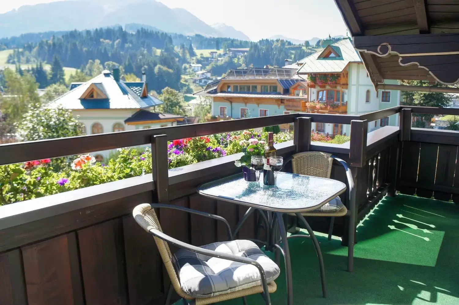 Großer Südbalkon mit Sitzgelegenheit und atemberaubendem Panoramablick auf den Wildseeloder und die Kitzbüheler Alpen