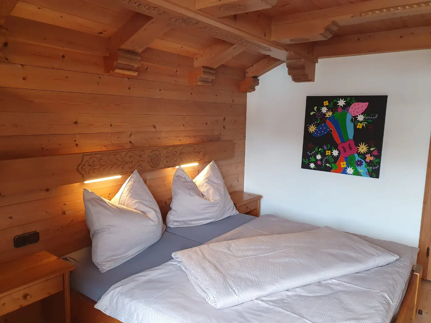 Wohnbereich mit umfangreicher Holzvertäfelung an Wänden und Decke, ausgestattet mit einem modernen Flachbild-TV und einer gemütlichen Sitzecke.